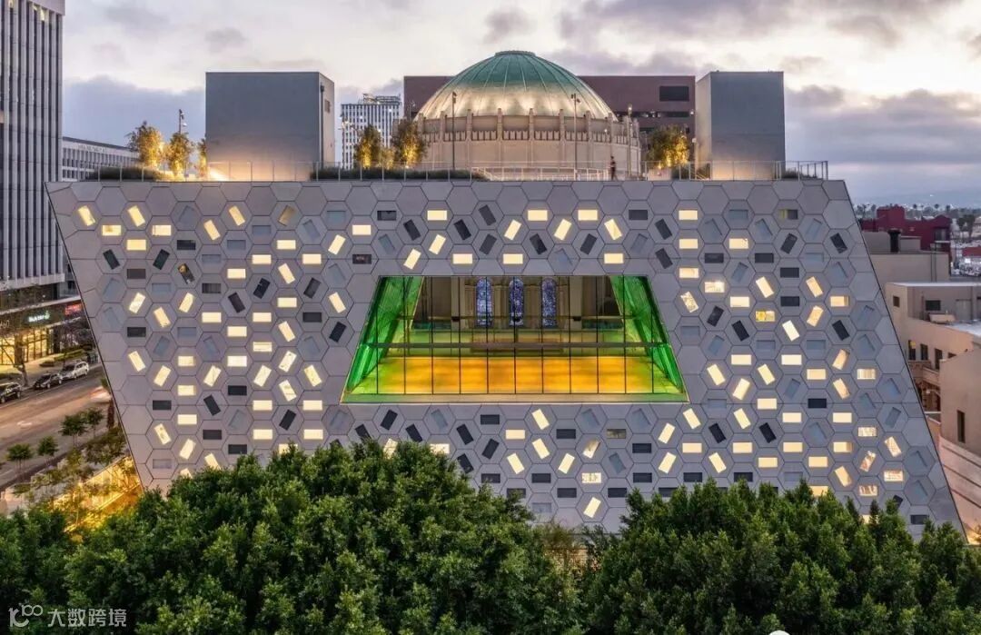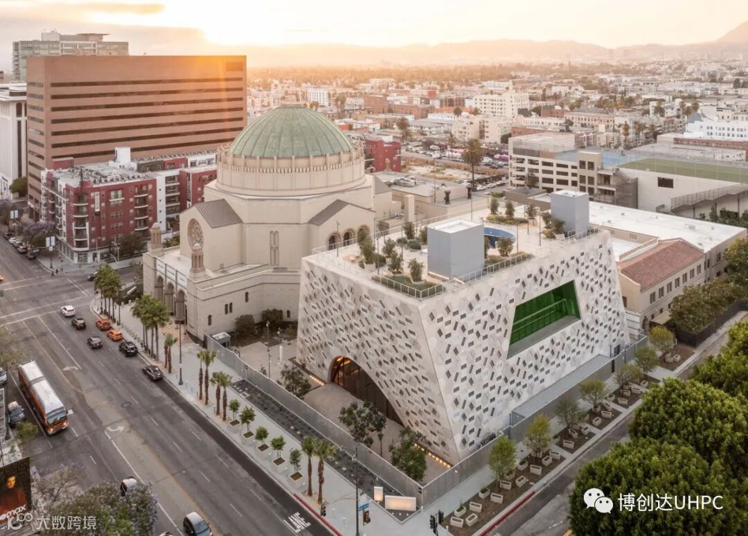 为了与周边环境相呼应,从威尔夏大道神庙的穹顶内部提取几何元素。一个带有矩形开口的六边形单元以不同的旋转角度排列,展现内部的同时,又为建筑创建了一种独特的图样。