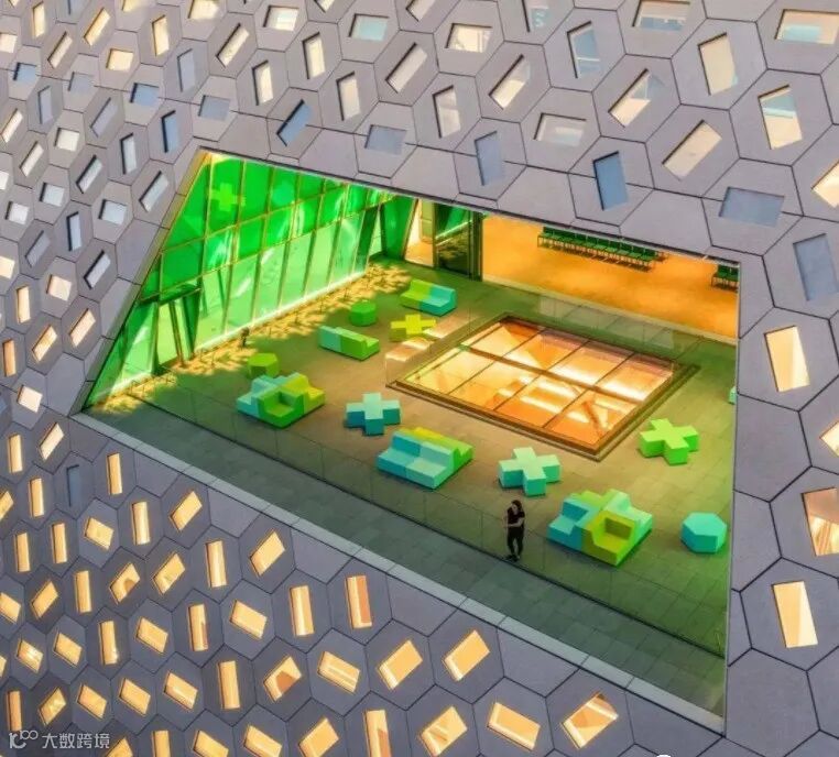 外立面看似中性的颜色,实则不同方向面板的颜色会随着不同时段的日光变化而变化。