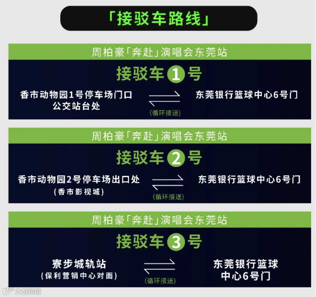 接驳车发班时间:7月6日16:30-20:00;演出结束后至24:00(10-15分钟一班次)。