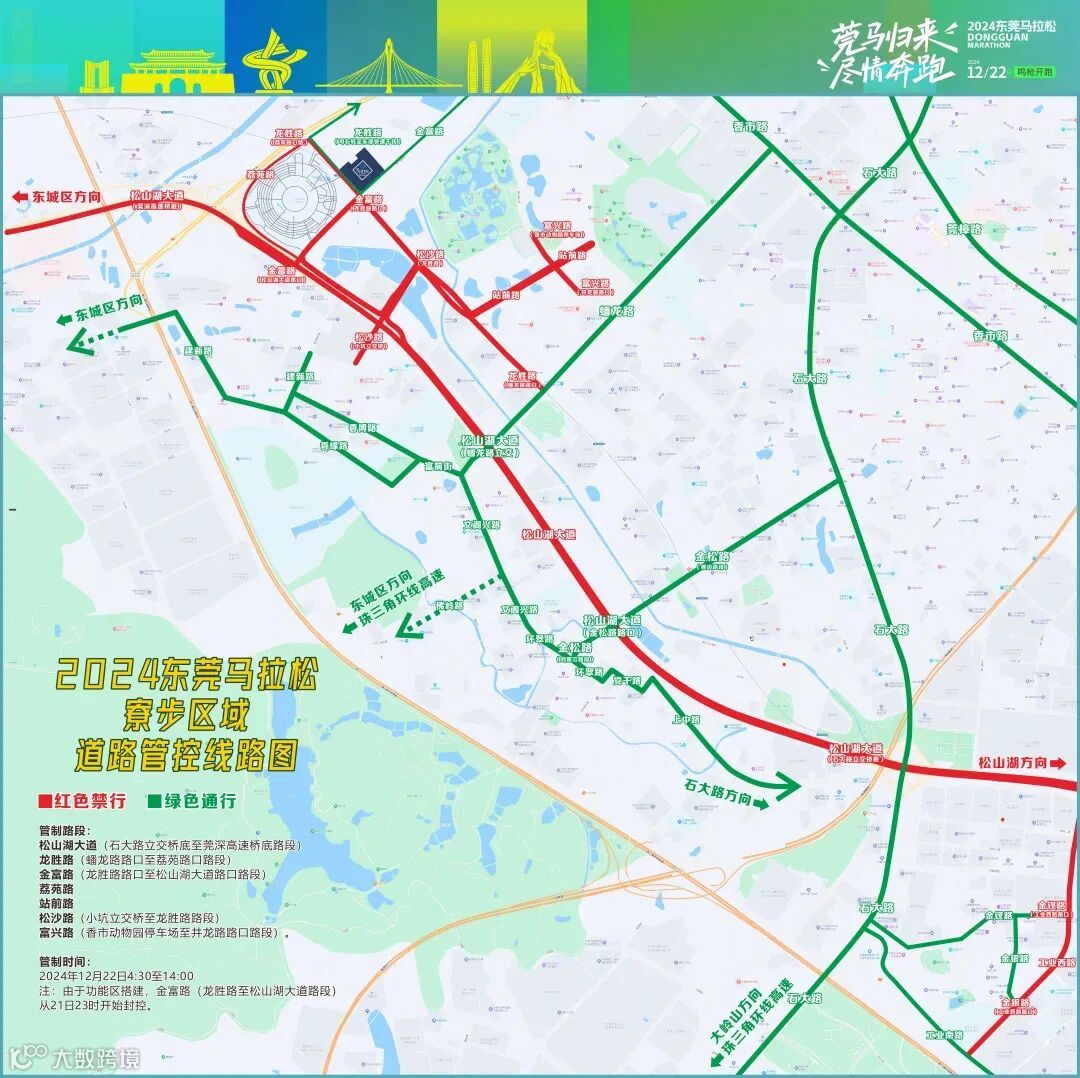距离莞马开跑越来越近,为确保赛事安全顺利进行,保障比赛期间辖区道路交通安全、有序、畅通,组委会将于比赛当天对南城、东城、寮步、松山湖等路段实施交通管制,请广大驾驶人及时调整出行时间及路线,以免耽误出行计划。具体管制路段和时间如下: