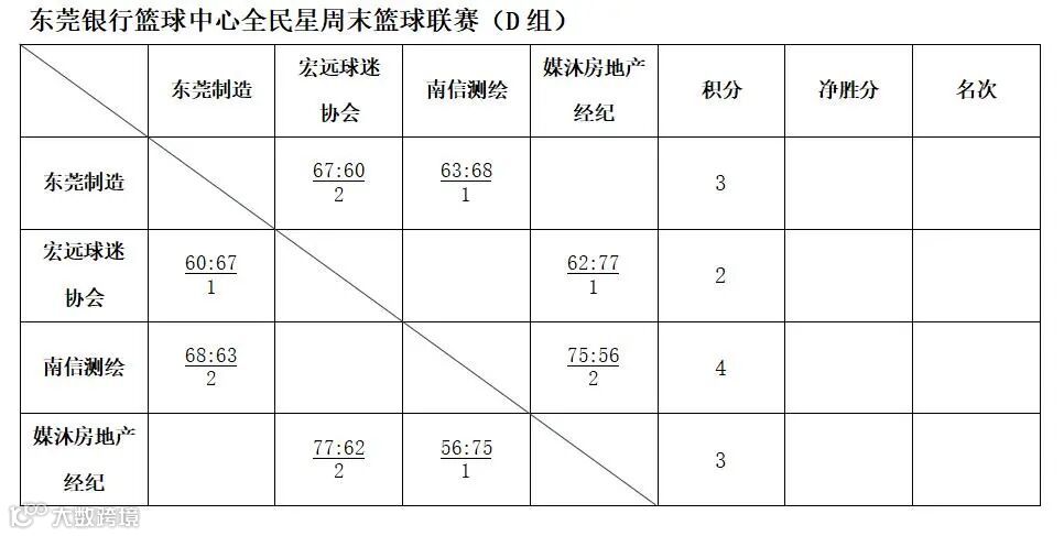 D组南信测绘险胜东莞制造已经掌握小组出线主动权,下轮东莞制造与媒沐房地产经纪比赛直接硬碰硬,谁胜谁出线。