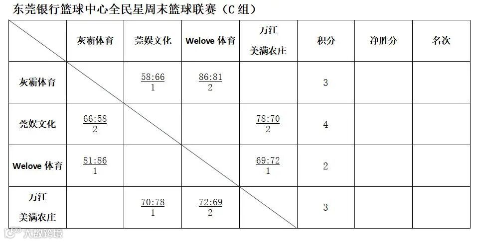 C组球队整体实力较高,两轮四场比赛胜负皆在10分之内,而且还是最后一刻决出胜负。莞娱文化两战全胜已经掌握小组出线主动权,下轮灰霸体育与万江美满农庄比赛尤其关键。