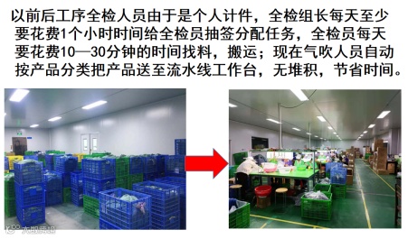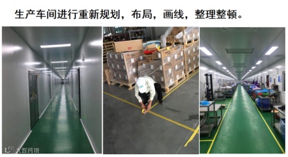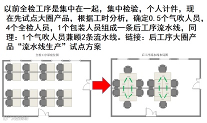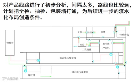 “流线化布局”中为DX企业的生产车间进行重新规划、布局、画线、整理整顿。把生产区和仓库区连通起来,加盖了顶棚,作为快速出货的中转站,勿需进仓,直接出货。同时对设备、工艺进行了分流设计,按产品进行分类,实行了产品的大小分流。