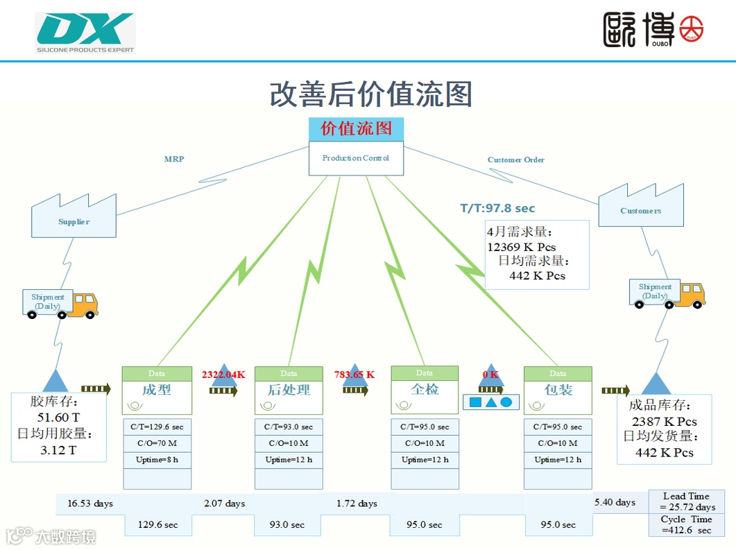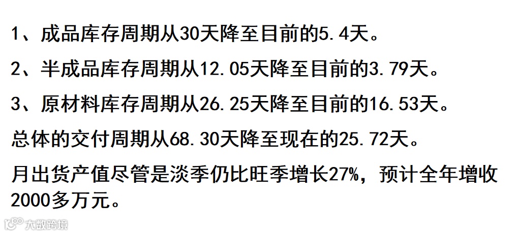DX企业的变革过程中,库存周期的改变相当明显。成品库存周期从30天降到5.4天,半成品库存周期从12.05天降到3.79天,原材料库存周期从26.25天降到16.53天。交付周期从68.30天降到25.72天,淡季月出货产值比旺季还增长了27%,全年预计增收2000多万元!