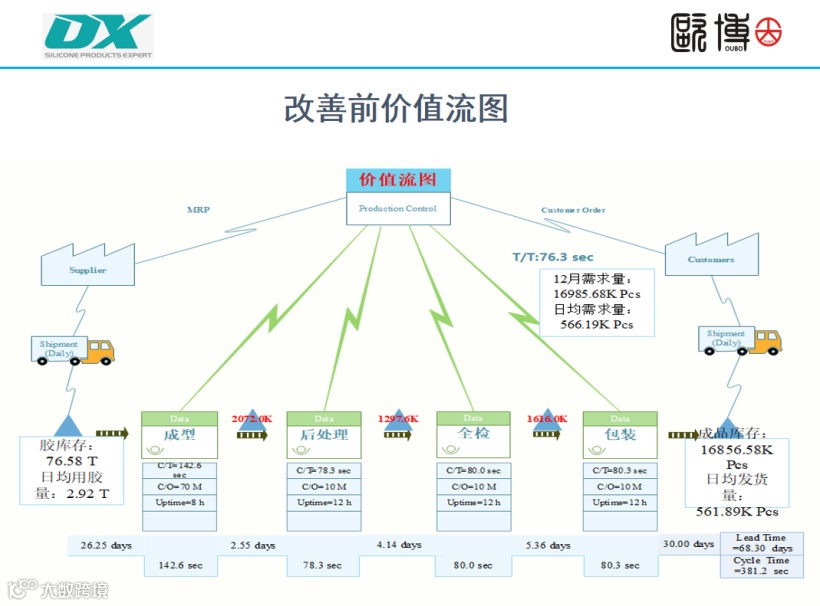 欧博老师通过“排查式后拉”为DX企业打造了全新的“计划表单流系统”,有效把主计划各块的信息进行整合。“订单物料管理系统”通过工程基础物料数据和业务、生产每日更新的统计数据对整个订单物料进行排查,做物料需求运算。“品质排查数据系统”对大量订单无法按时出货及品质问题,进行系统数据分析。