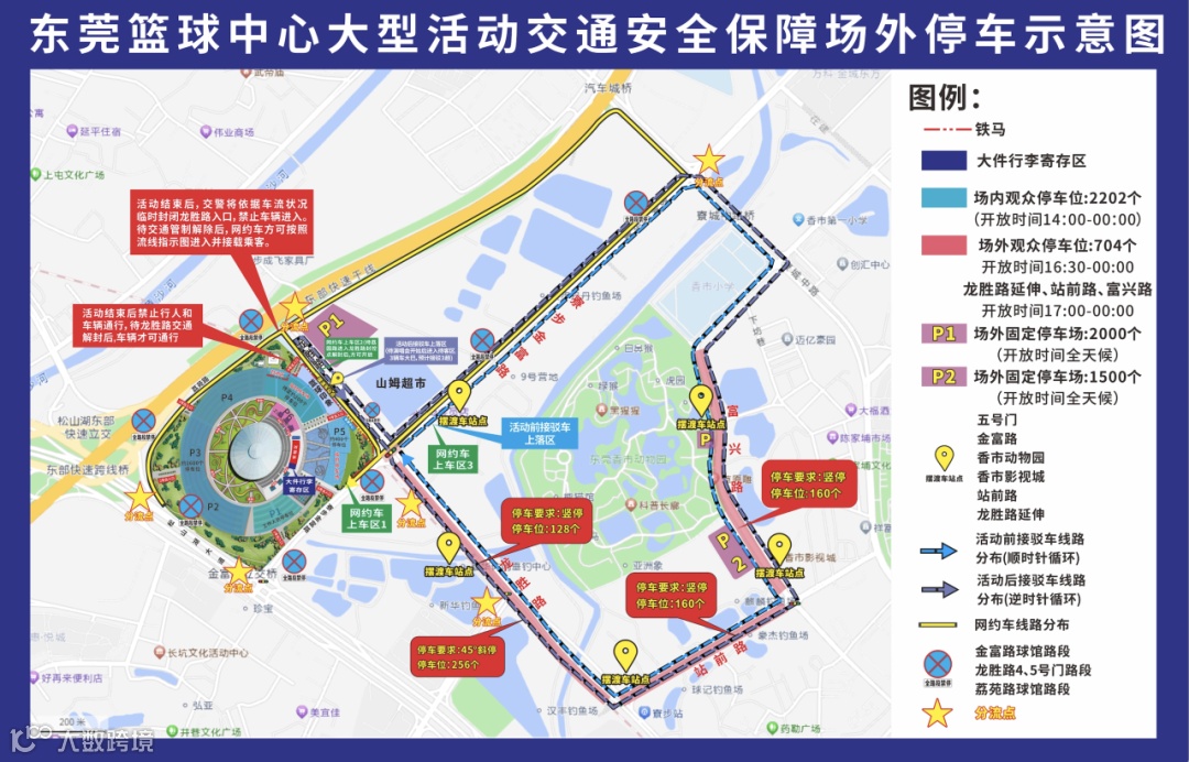 演出日东莞银行篮球中心开放P2、P3、P4、P5停车场,观众车辆可从2/3/6号门进入场馆停车。