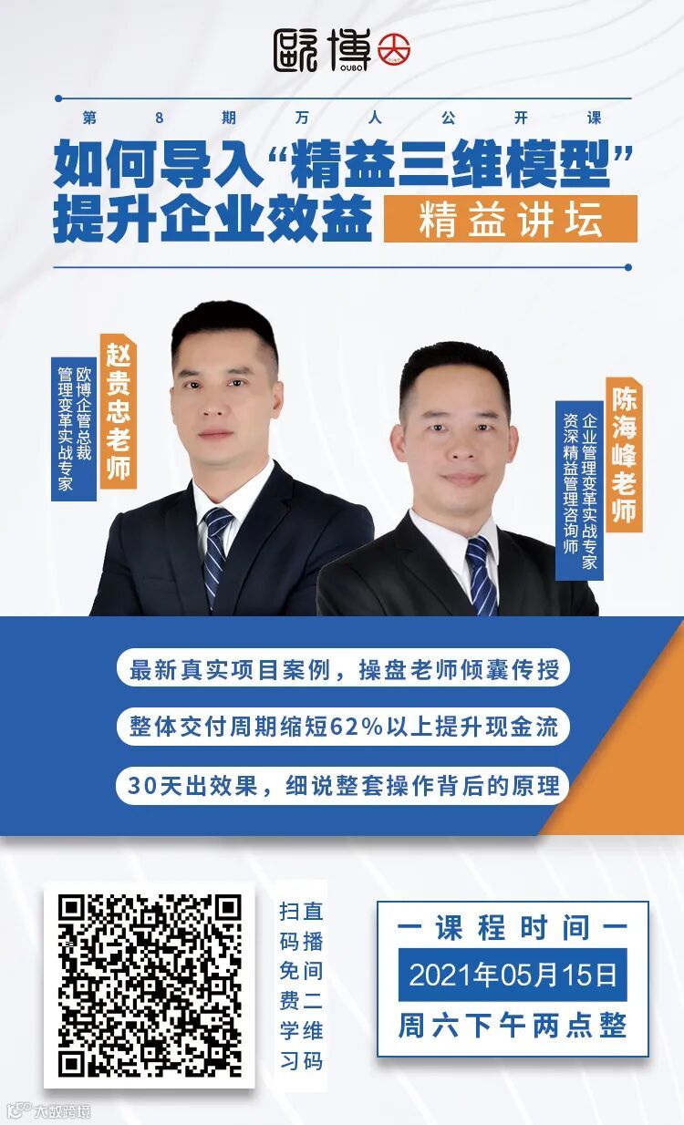 本期课程由欧博集团赵贵忠老师、陈海峰老师一起与大家互动交流,围绕《如何导入“精益三维模型”提升企业效益》主题展开分享,让企业正确的学“精益”、用“精益”,真正从根本上解决企业的问题,让“精益”真正落地!