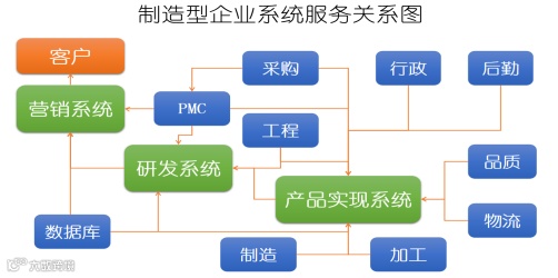 通过上图,我们可以看出,营销就是面对客户的,这点容易理解,客户从营销这里把产品给买走了,就有了价值;研发系统把满足条件的产品提供给了营销,也就有了价值;那么产品实现系统实现了满足条件的产品,并交给了营销,也是有了价值体现,但这里产品实现系统实际上是先将产品提供给研发系统再转给营销系统的逻辑,因为研发系统是输出标准的、并持续完善标准规划的一个系统,比如说研发给品质一个检验标准、给物流一个运输标准、给工程一个工程改善规则、给行政一个行政干涉范围、给加工厂一个加工标准、给采购一个采购标准等,产品能否符合客户需求,在产品生产出来后理论上是要研发给出评判的,所以生产是将产品交付给研发并服务于研发的一个过程;其它的所有职能部门系统均是围绕着这三个主要系统提供服务的。