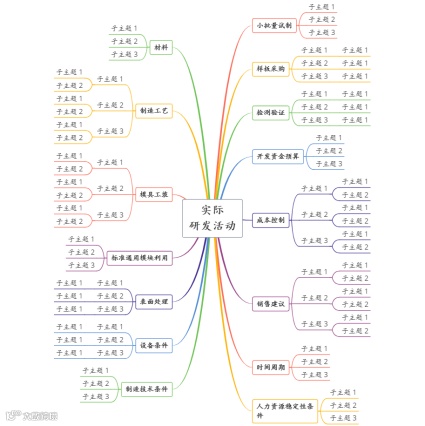 第二重拉动,就得依靠各科室的负责人岗位了,各专业性很强的识别,专业能力水平限制了大多数的企业管理者无法了解某项研发活动是否具有价值。比如,一个新的研发需求在图纸设计进行中,是否具备模具成型的技术要求?试想,如果完整图纸已经绘制出来了,拿到模具加工厂一看就能让人知晓,但问题就在于图纸正在进行中,无法拿出来,如果按流程走,进度无疑是拖的比较长,从精益思想的角度看是不符合客户需求的。各科室各专业带头人的第二轮梳理,“子主题”选项中的有价值的活动就进一步筛选出来了。