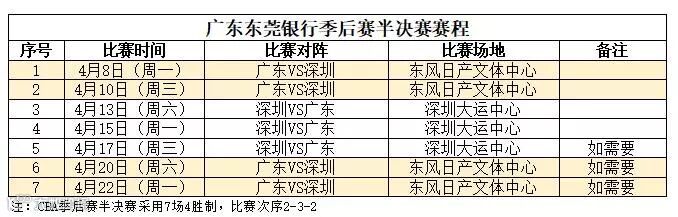2018-2019赛季CBA季后赛四分之一决赛广东东莞银行3:0横扫江苏晋级CBA半决赛,广东东莞银行将在CBA半决赛对阵深圳马可波罗。CBA半决赛采用2-3-2赛制,4月8日(周一)和4月10日(周三)广东东莞银行率先在主场东风日产文体中心进行广东德比。