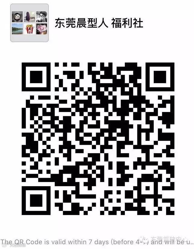 除了在线上活动,我们还特地组建了东莞首个晨型人微信群,让志同道合的大家在线上或者线下活动相识相知相遇在一起!(长按二维码加入晨型人福利社)