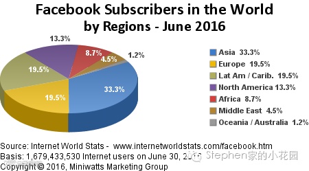 Facebook活跃月用户按比区占比,欧美比区只占大约1/3左右