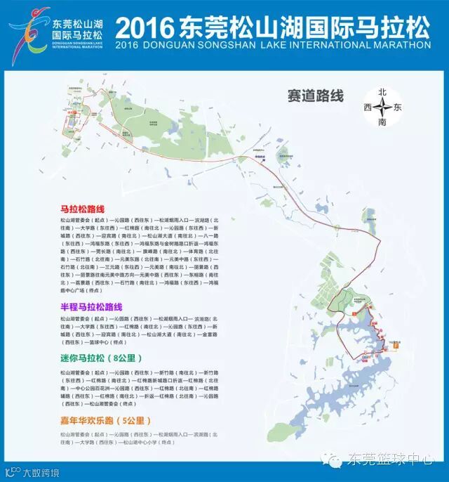 马拉松起跑点设在松山湖管委会,全程马拉松终点设在市政府中心广场,半程马拉松终点设在东风日产文体中心,8公里迷你马拉松跑回起跑点,5公里嘉年华欢乐跑沿着松湖烟雨湖滨路到松山湖中心小学止。