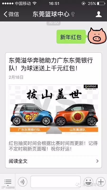 1、在东莞篮球中心微信页面回复“新年红包”关键字