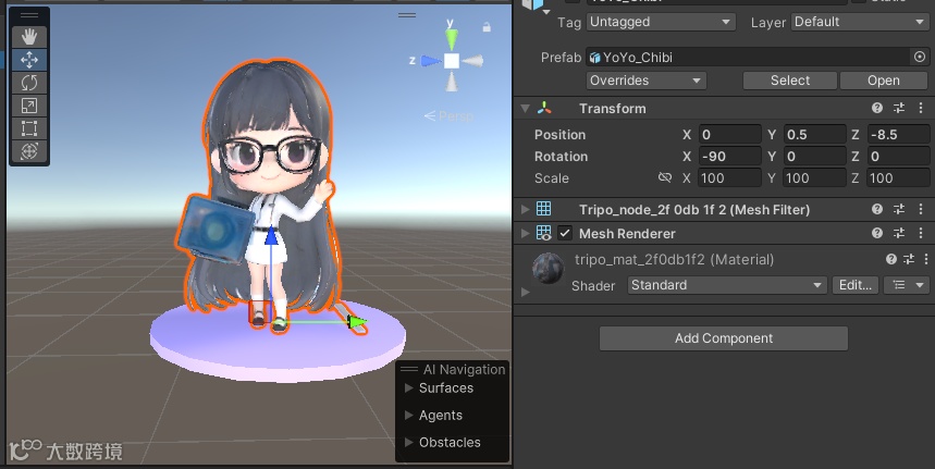 呵呵,别担心,希洛。你做得非常完美!这个 -90 度的旋转,是 Unity 为了补偿两个软件坐标系的差异所做的适配。它告诉我们,这个模型来自一个 Z 轴朝上的世界。这是一个完全正常的现象。