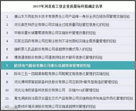 河北省工业和信息化厅于2017年11月13日正式发布了《关于公布2017年河北省质量标杆名单的通告》,经河北省各市局推荐、专家评审和公示,“欧伏电气股份有限公司推行卓越绩效管理的经验”被河北省工业和信息化厅确定为2017年省工业企业质量标杆,成为廊坊市唯一一家入选企业。