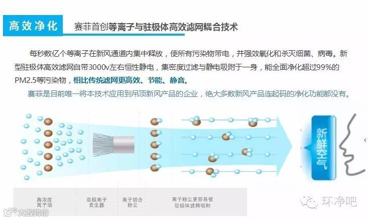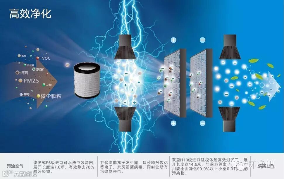 采用滤筒式F6级韩国进口驻极体中校过滤网,展开长度超过7.6米,有效去除99%污染物。万伏高能量离子发生器,每秒数亿等离子释放,杀灭细菌病毒,同时让整个腔体内的空气带电。