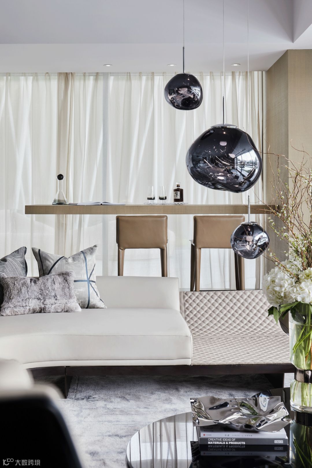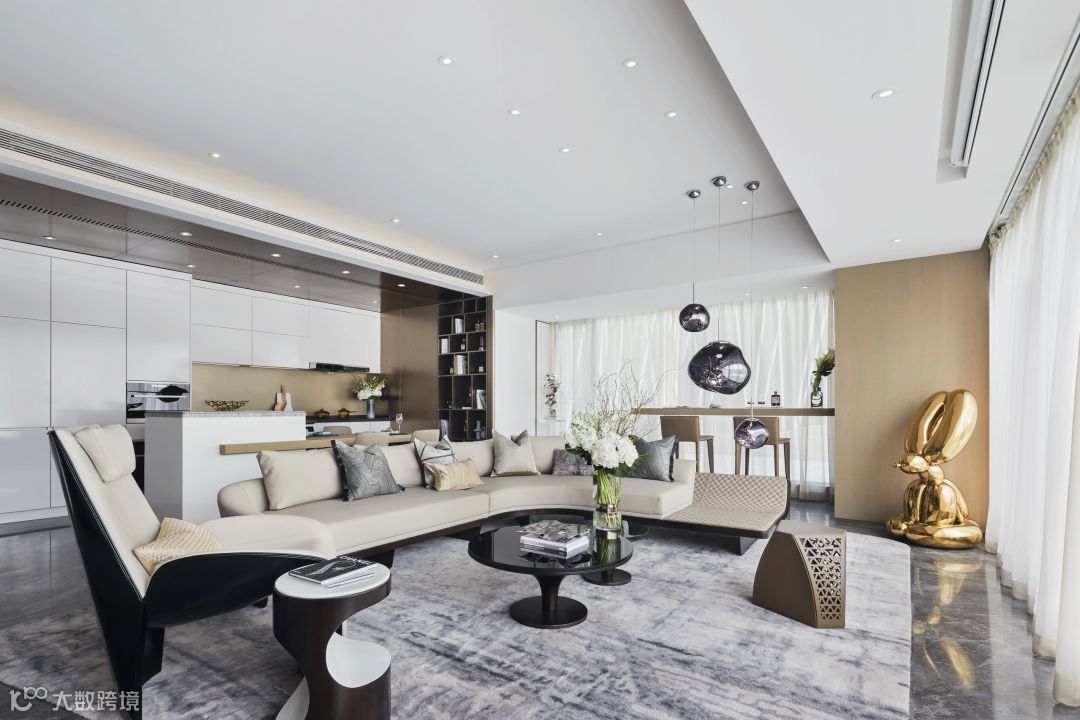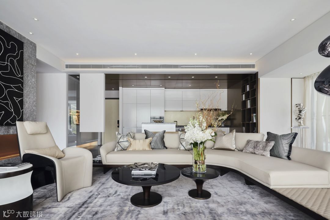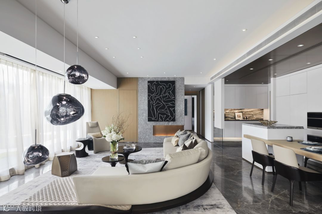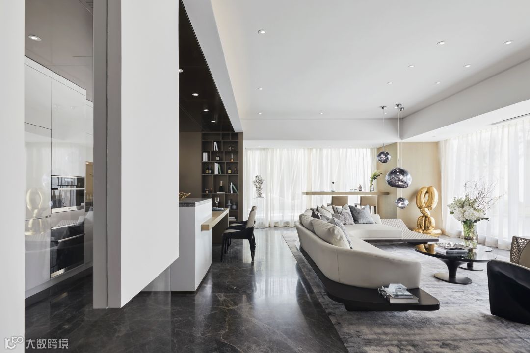 再者,为使同一空间的开放式客厅、餐厅、厨房和吧台之间更加充殷饱满,客厅以大弧度Pininfarina Segno沙发、高低错落的Roche Bobois圆茶几、Giorgetti单椅这样的围合形式,将空间视觉感与整体品质提升到绝佳状态,赋予一种极致灵动的空间感。