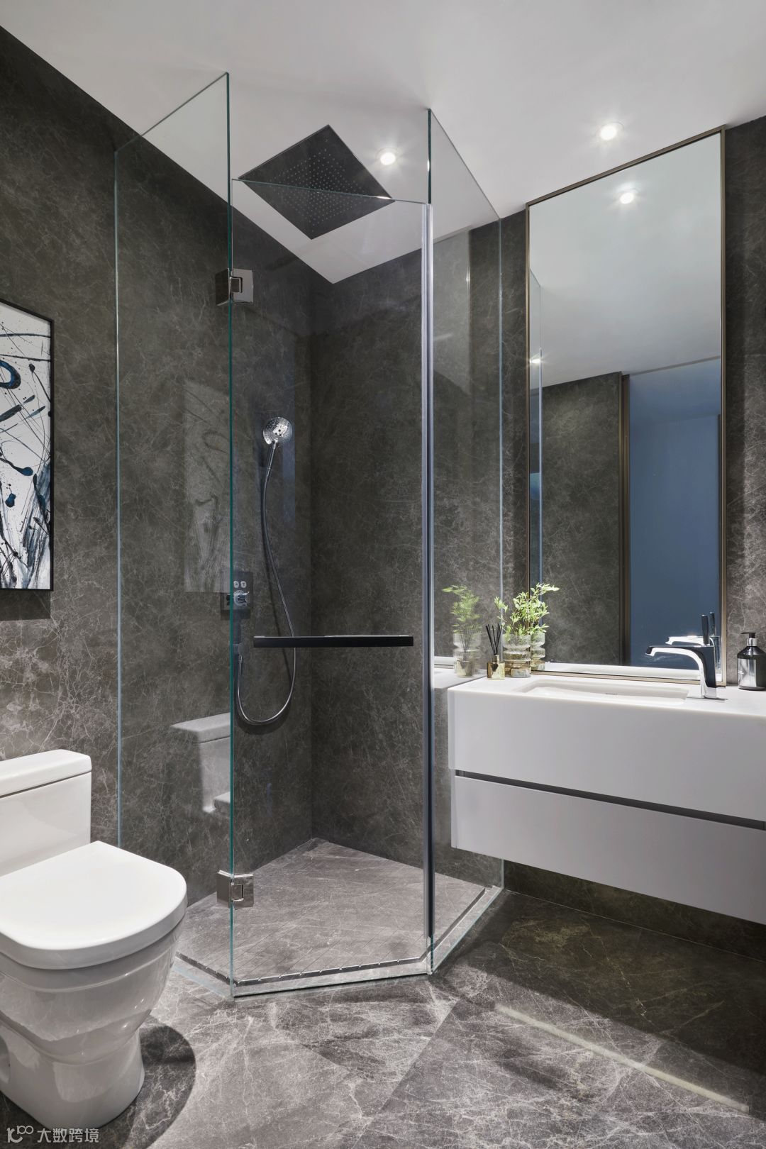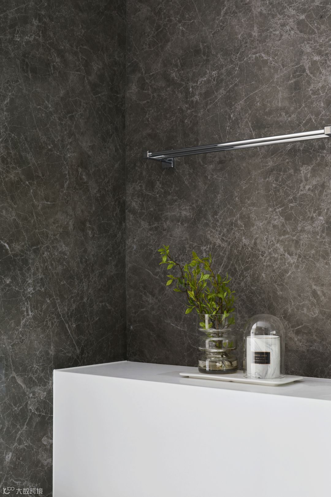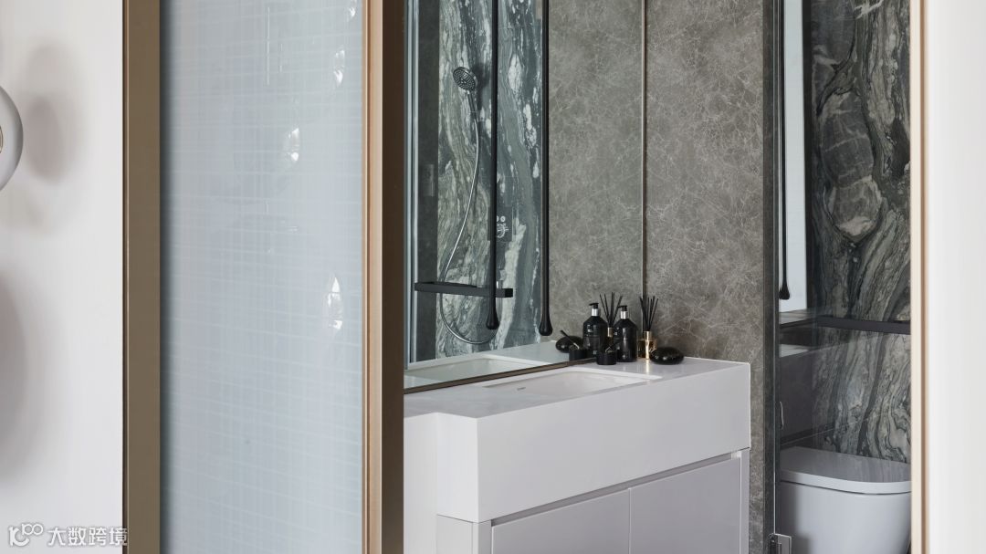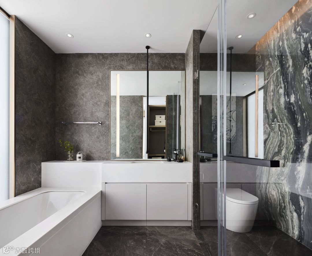 浴室的简约极致,在灰墨色大理石肌理感中与白色调之间保持着柔和的理性,浴缸边大胆的落地窗设计将室外自然景观融入空间,倒有些“醉翁之意不在酒,在乎山水之间也”。