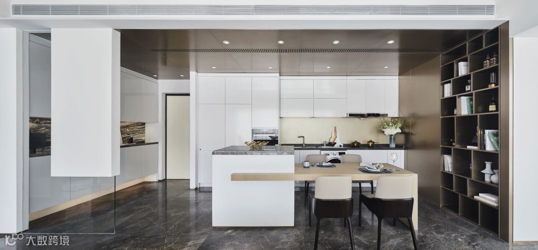 厨房与餐厅之间就在几何框架的有序布列中,打破了空间主次之分,同时纳入部分书房的功能,进一步扩展了使用性,让人在模糊的空间边界里摸索更