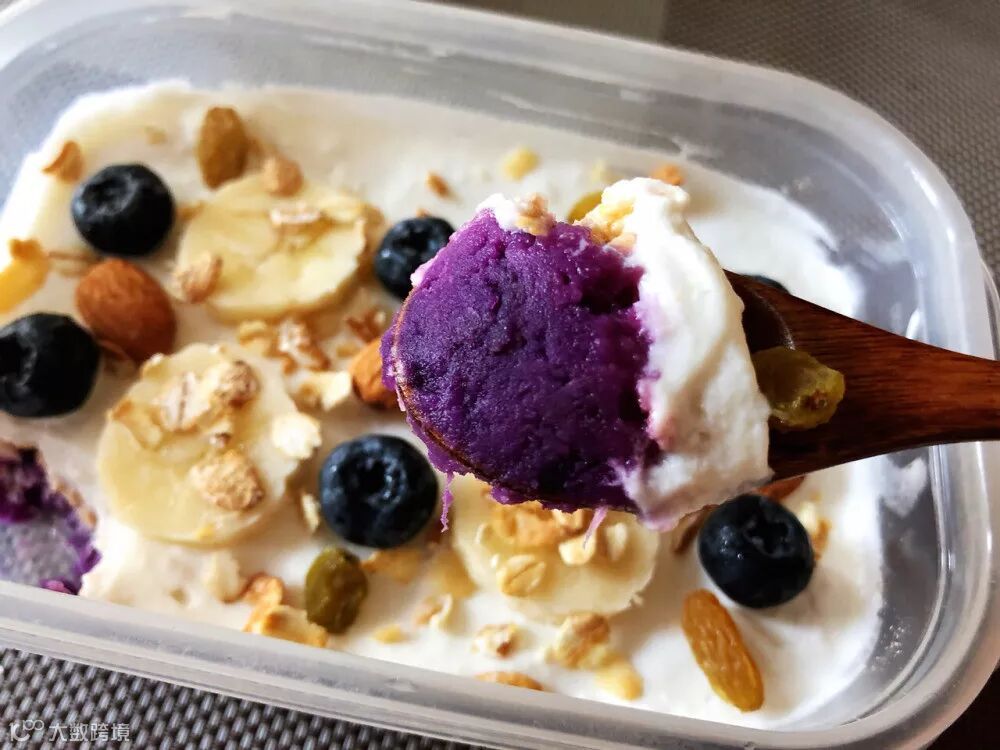 材料:去皮紫薯100G,即食燕麦25G,酸奶120G,香蕉 蓝莓 坚果若干