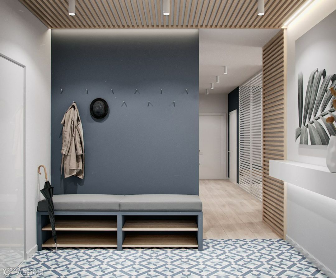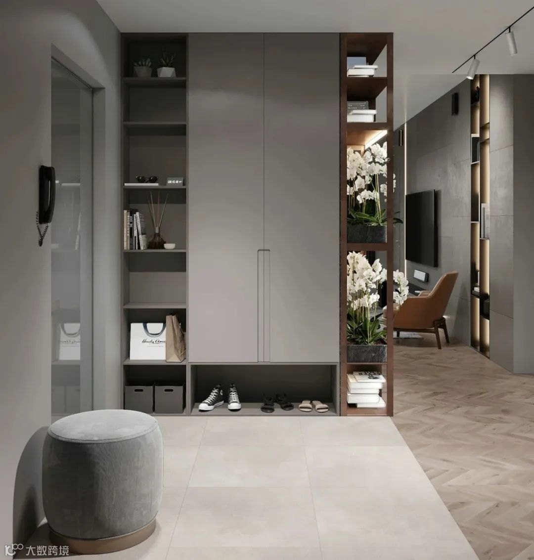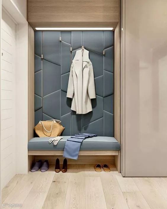 外出穿的衣物一般建议在门厅就脱掉,这样预留一面挂衣墙必不可少,如果位置空间大挂衣区可内嵌于鞋柜中,下面设置换鞋凳。美观又实用。