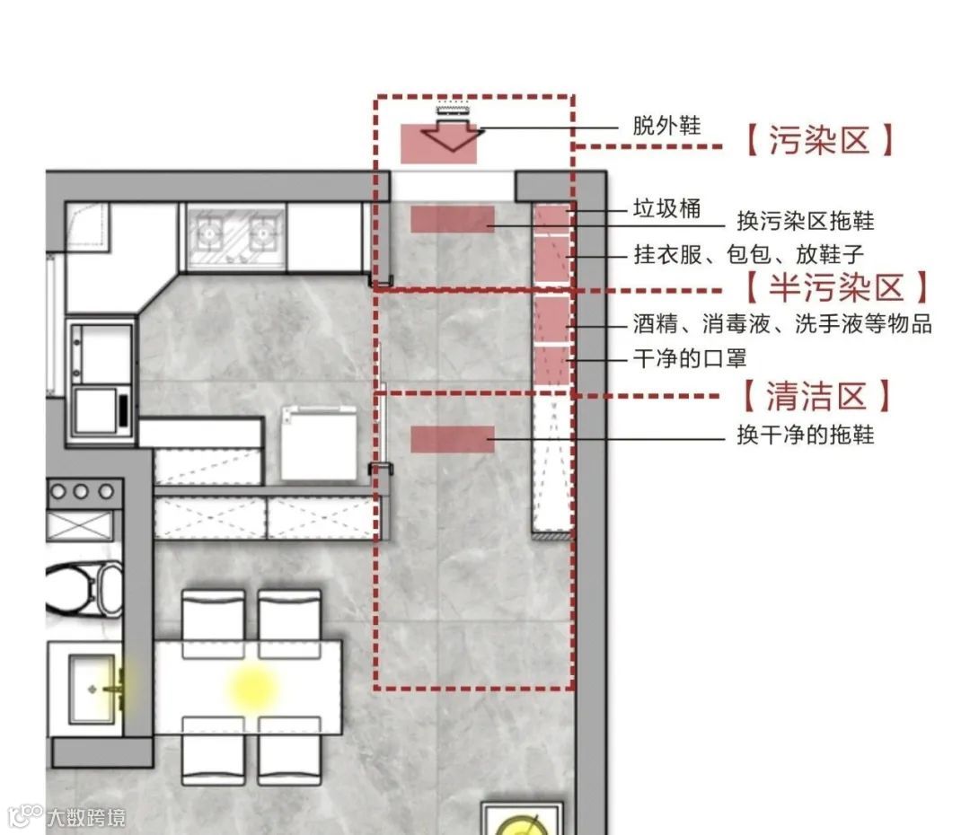 通过以上调查,结合当前疫情环境,为了长期的生活居住健康安全,说明我们对玄关这个设计应该多加一项功能,不仅仅是风水,好看,它的功能性需求更为重要。可通过分成【污染区】、【半污染区】、【清洁区】三个区域,实现美观的同时并隔绝从外头携带回的病菌。
