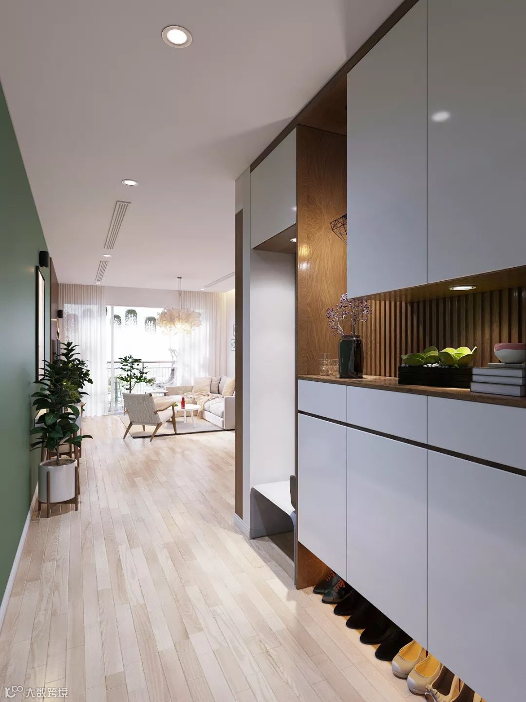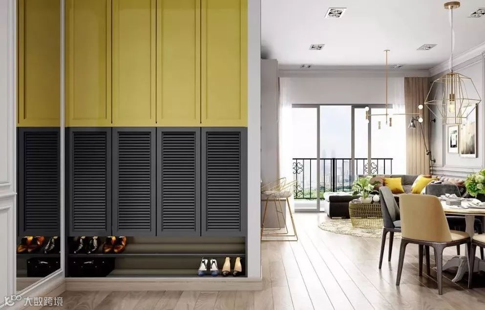 把鞋柜下面预留150-200mm的开放式空位,进出要换的鞋直接不用弯腰不用手就可以换上,干净卫生,还会让门厅处更为干净整洁。