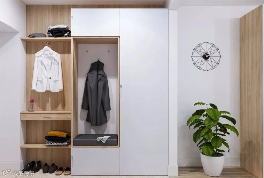 要是地方没有那么大,可以在一面墙装几个衣帽钩,把衣物单独挂在这里。进出也方便些。