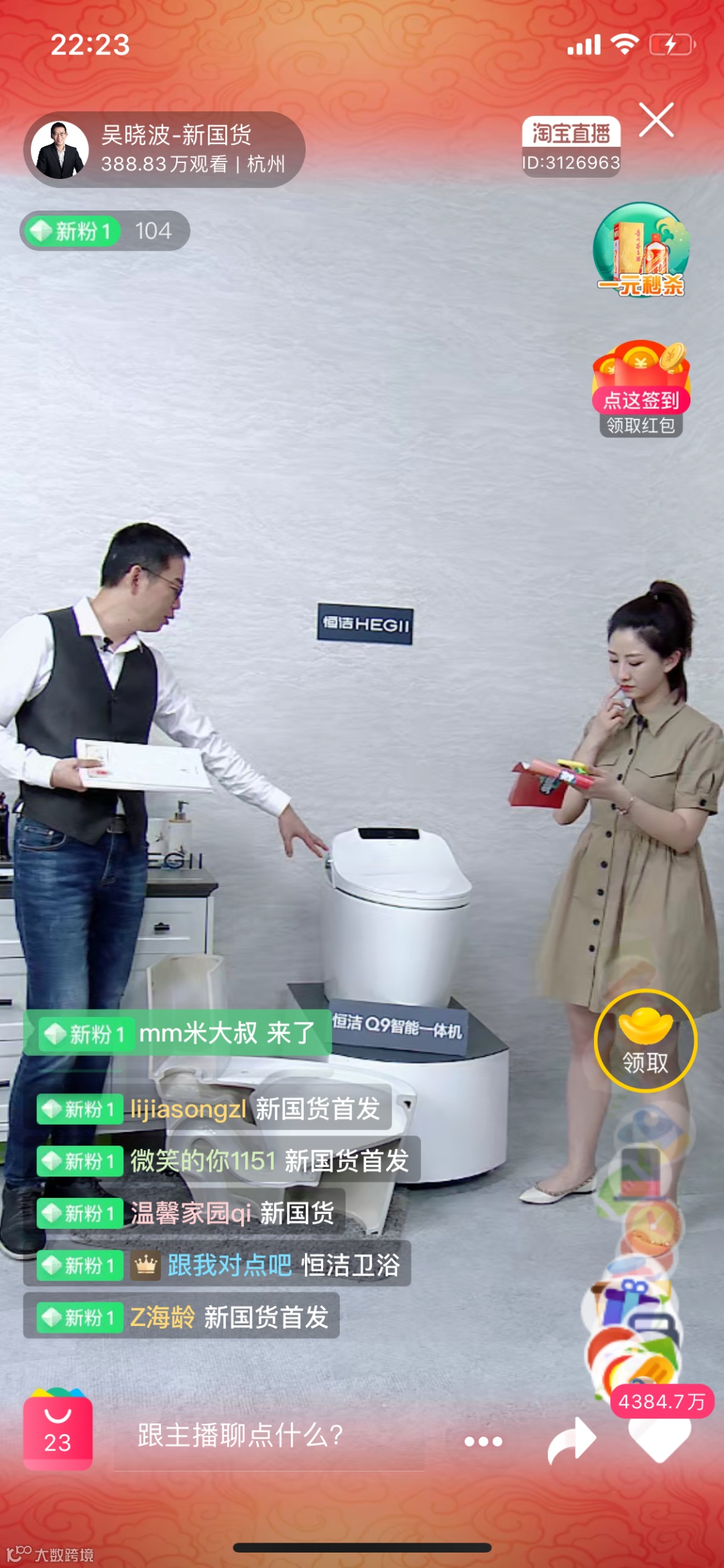 吴晓波首先介绍了一个恒洁卫浴品牌故事,就是2015年他写了一篇爆文:去日本卖马桶盖。当年,恒洁卫浴的老板谢总,就请吴晓波去了恒洁工厂,亲身去了解中国高质量的智能马桶,吴晓波印象非常深刻。直播开始,最震撼的就是,吴晓波拿出了厚厚一叠的40多张专利证书,就是恒洁卫浴的专利,匠人新国货,名至实归。对于恒洁卫浴Q9的介绍,虽然恒洁卫浴大老板与高管不能亲自出镜站台是个遗憾,直播间的主播介绍还是非常到位的:一键智能、两档智能确认键、自动开启马桶盖、坐马桶的防麻腿的功能,都介绍的比较充分。恒洁卫浴靠自己的硬核产品功能在直播间独领风骚。