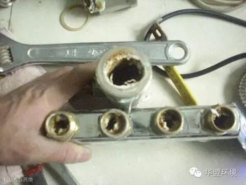 分集水器连接管管壁内侧呈黄色、绿色、红锈色、黑色等。这是由于钙镁离子垢和生物粘泥长期沉淀和附着在管壁内侧造成的。