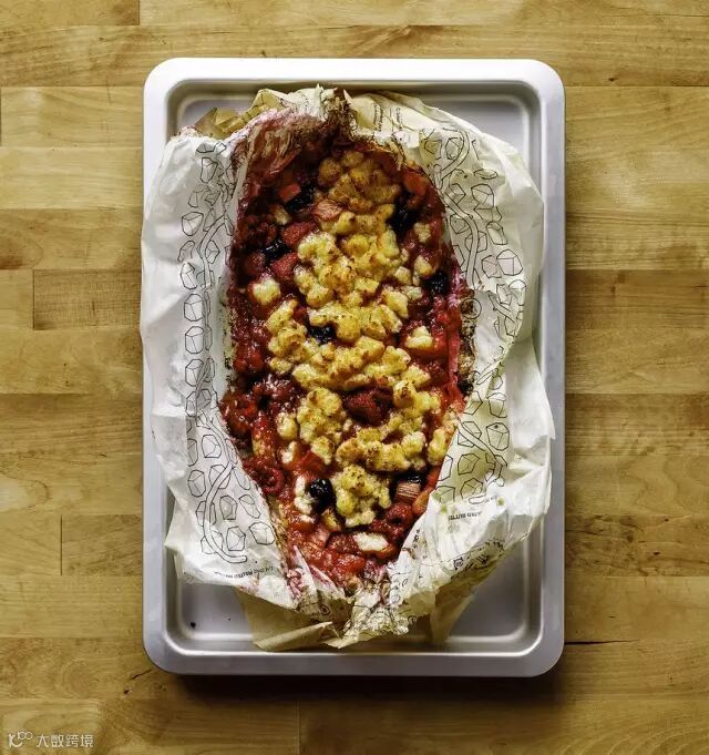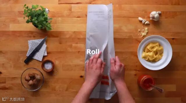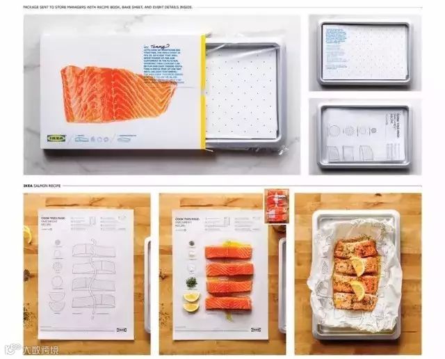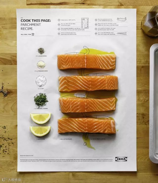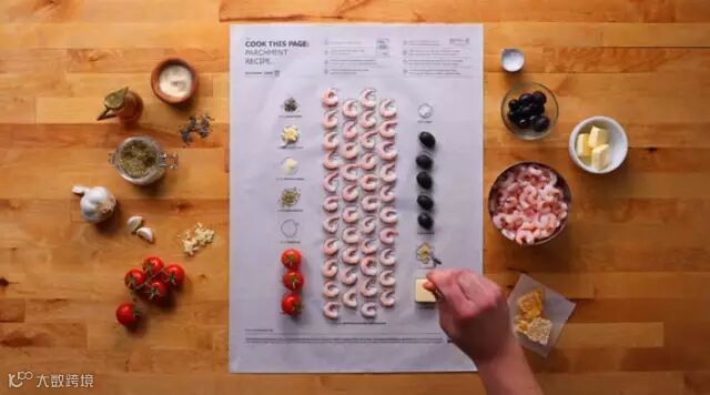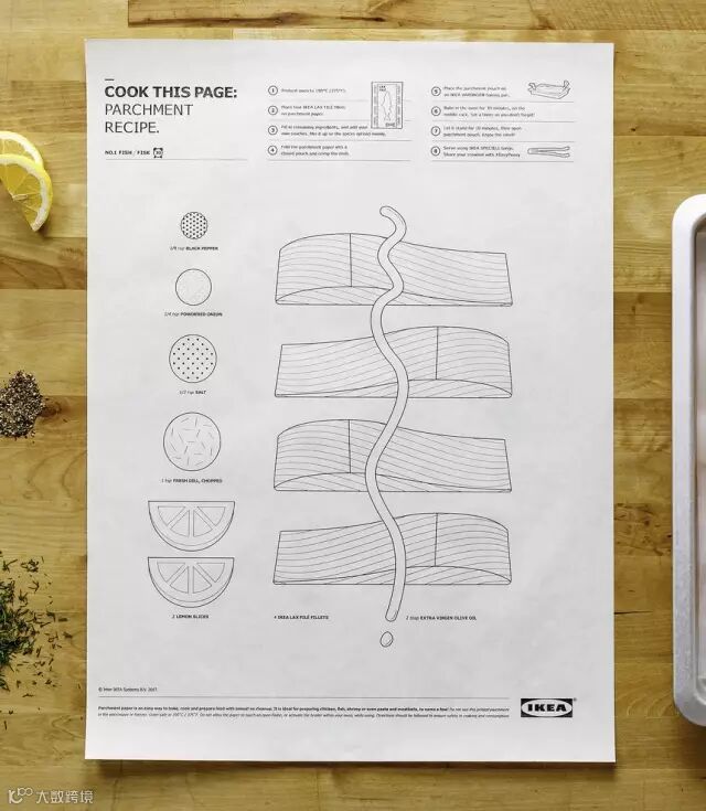 宜家将食谱印在了烤纸上,准厨师的你只需要按照图纸上的配方一一放好,将食材卷起放入烤箱就好。
