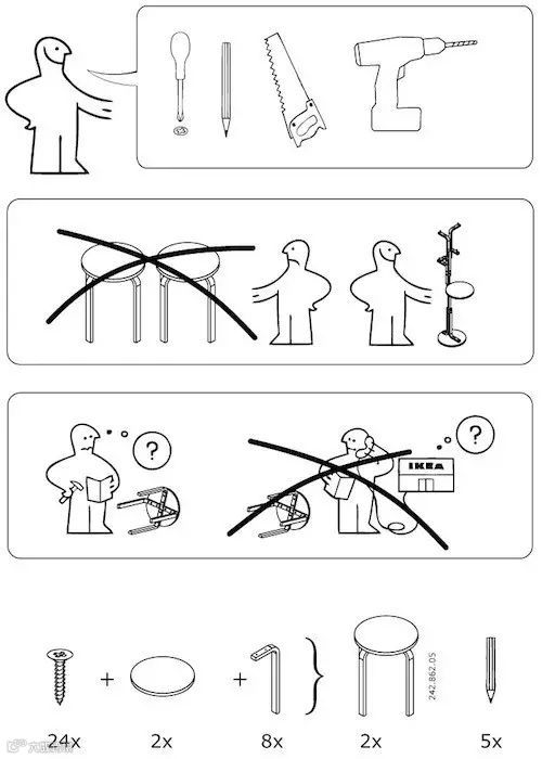 宜家的安装图纸是出了名的细致、易懂、流程清晰,按照图纸的步骤,零件编排,就算是工程小白,也可以一步步把自己心爱的家具拼装出来。