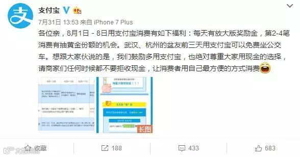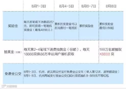将从8月1日到8月8日一周时间内,提高支付宝支付的“奖励金”,消费2元以上可能有4888元奖励。每天消费2-4笔,还可抽取黄金。部分城市可免费坐公交车。
