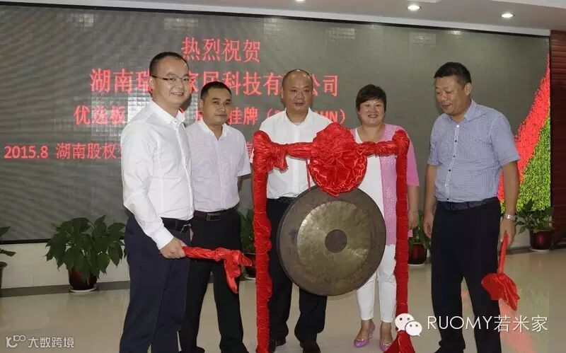 8月13日,瑞兹家居正式在湖南股权交易所优选板(Q板)挂牌(股权代码:300381HN),并于当天下午在股交所交易大厅举行了隆重的挂牌敲锣仪式。这是湖南瑞兹家居科技有限公司首次登陆资本市场,为瑞兹家居以后改制成瑞兹家居科技股份有限公司、进入E板等战略部署打下了基础。