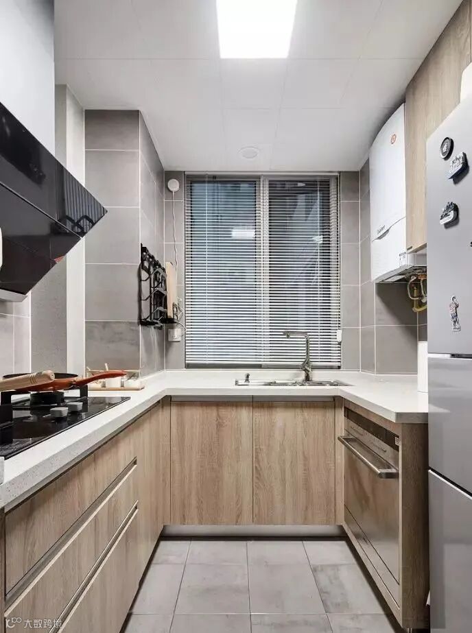 厨房使用灰色水泥瓷砖搭配木质橱柜,使用方便而且方便打理;白色大理石台面,视觉上干净清爽。