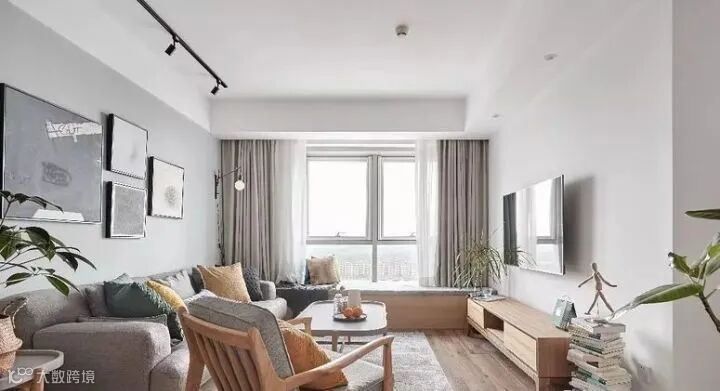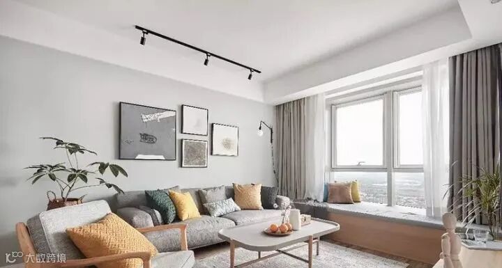 客厅是年轻人喜欢的北欧风。灰墙搭配原木色轻巧家具,不仅显得空间宽阔,而且保证室内明亮。无主灯设计采用一组滑轨灯辅助照明,不仅满足日常照明功能,而且还能作为装饰。