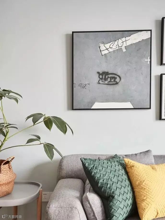 灰色布艺沙发,简约编织抱枕,北欧风格的小盆绿植,再加上几幅黑色线条的挂画,轻松明亮,百看不厌。