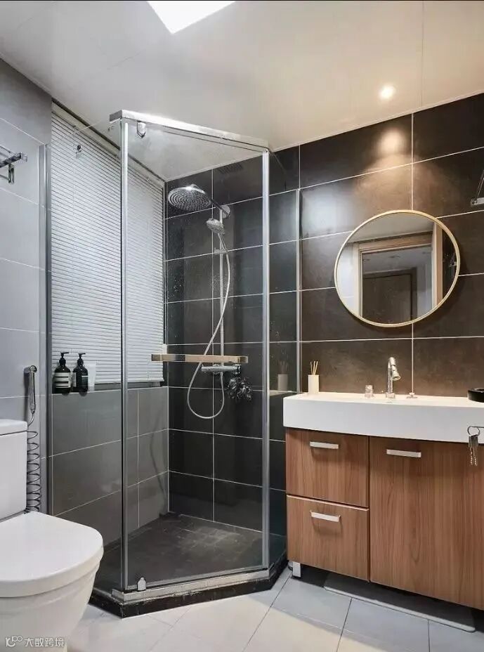 卫生间同样使用灰色的瓷砖,加上浴柜圆镜配置简单。淋浴房的地面使用单独的防滑石材。侧面墙壁使用深色瓷砖与灰色形成了对比,让空间更有质感。