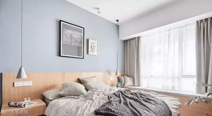 好的睡眠需要好的卧室。主卧没有复杂的床头,整体采用木质饰面,床头与飘窗柜体一体设计,更简洁舒适。水泥吊线灯辅助照明,光感柔和舒适。