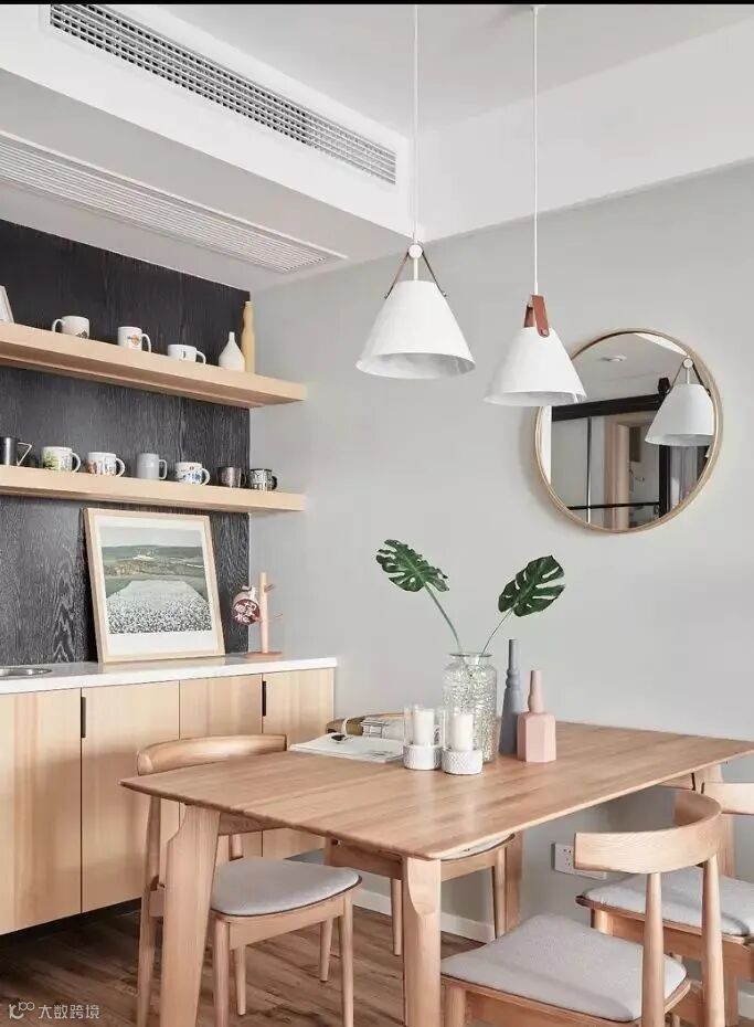 餐厅靠墙做了一个水吧,休闲时间可以喝咖啡,充满生活情趣。北欧原木餐桌椅,轻巧灵便,不会显得空间拥挤。