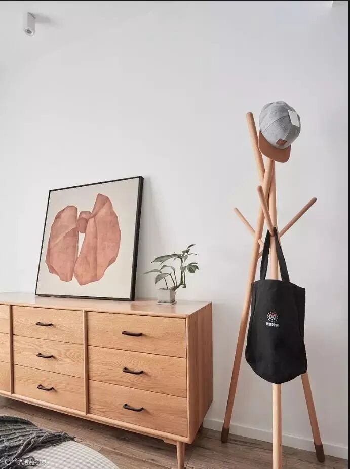 主卧床尾放置多抽屉斗柜,加上一个简易木质衣架,同时兼具收纳和放置功能。