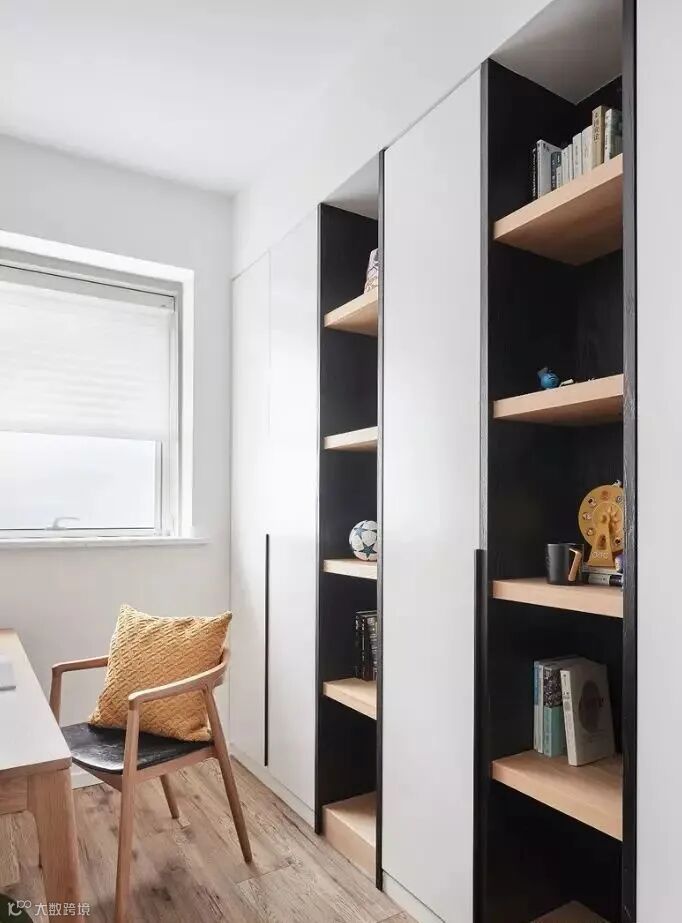 书架采用木色板面黑色作为整体,黑白与木质的搭配协调。镂空的部分放书,带柜门的部分收纳杂物,有效的保证空间整洁。
