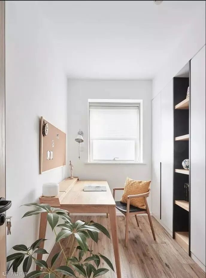 书房采用原木简单书桌椅,墙上软木背景可以贴照片和各种备忘录。后面整面墙定制书架,白色与木质套色,经典搭配,清爽干净。
