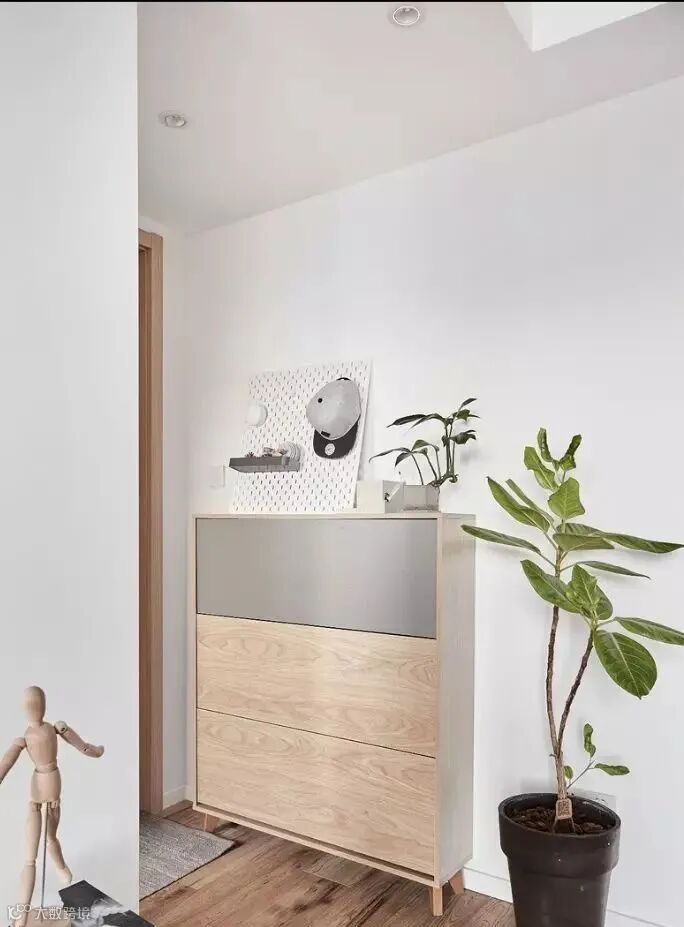 进门就是门厅,一眼到头就是客厅。超薄鞋柜搭配地毯的布置,减少压抑感。旁边绿植变成了玄关和客厅的分界线而且进门的绿色会让人心情变好。鞋柜上是洞洞板,收纳超多非常实用,可以挂各种进门小物件而且颜值满满,值得入手。