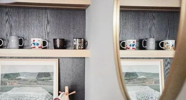 水吧台兼顾餐边柜功能,黑色的背景板与木色吧台形成冷暖对比,放置一排喜欢的马克杯,即实用同样也是装饰。