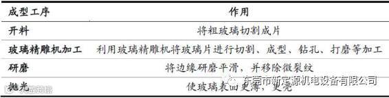 从整个玻璃盖板的加工工艺来看,玻璃盖板加工分为:成型、化学强化、清洁和涂层共4个工序,其中成型工序又可以分为数控开料、玻璃精雕机加工、研磨和抛光等步骤。