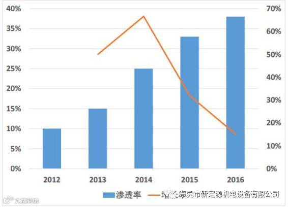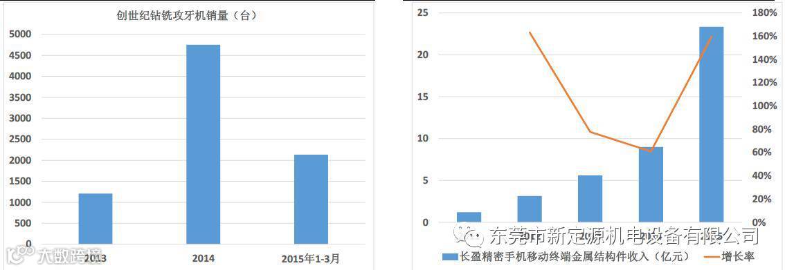 从上图表可以发现,在A客户大量采用金属机壳后,金属机壳渗透率快速上升,从2012年的不足10%,上升到2016年38%,金属机壳需求的迅速增长催生了下游企业长盈精密、春兴精工、胜利精密等公司手机及移动设备终端金属结构件业务快速爆发,尤其以创世纪为代图表的国内CNC钻铣加工机床厂商销量也出现快速上涨。