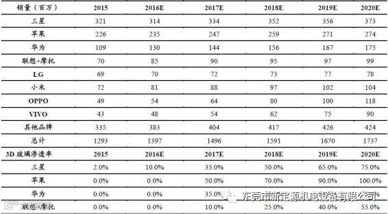 未来三年,随着OLED屏的大量使用,3D玻璃盖板必然是大势所趋。结合金属机壳的发展逻辑,和智能移动终端快速升级换代,我们看到,3D玻璃渗透率也将快速增长。不考虑折旧,假设到2020年3D玻璃盖板在A客户的渗透率为100%,三星和华手机的渗透率为75%,小米的渗透率为70%,OPPO和VIVO渗透率为60%,则2020年3D手机玻璃盖板的需求量为11.47亿片,如果考虑80%正面盖板使用3D玻璃的手机背板也使用3D曲面玻璃,则需要21亿片3D盖板玻璃,热弯机需求量约6000台左右,每台热弯机180万元计算,仅手机厂商的玻璃热弯机需求空间就超过100亿元。