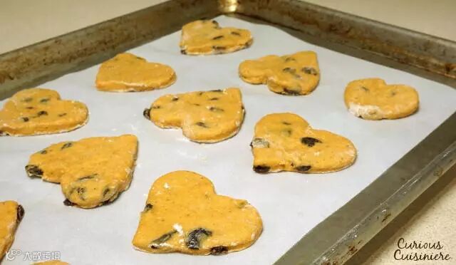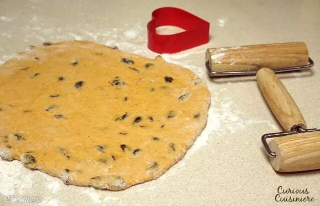 6. 把面团擀成1/2英寸厚的面片,用饼干模具切割出想要的形状,把剩余的边角料再次揉成团切割,直到面团都被用完。